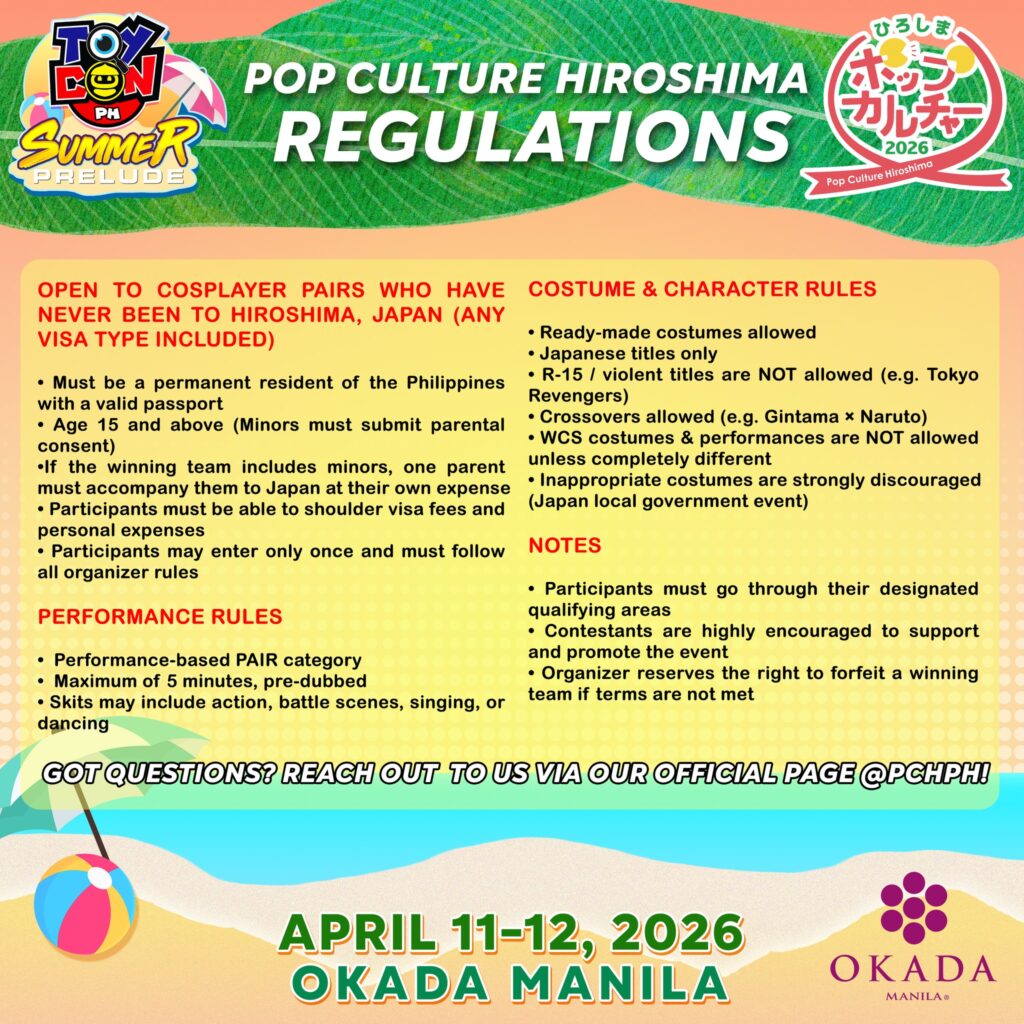 Selected pairs will advance to the Grand Finals (Event & Venue TBA). The winning team will represent the Philippines at Hiroshima Pop Culture Japan 2026.