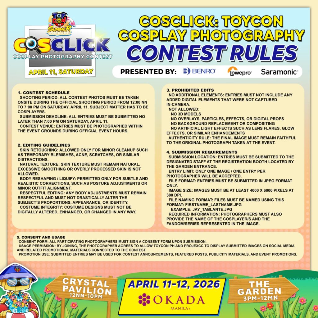 Usage Permission: By joining, the photographer agrees to allow TOYCON PH and ProjEXcc to display submitted images on social media and related promotional materials connected to the contest.